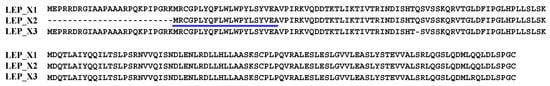 The prediction identified a signal peptide in buffalo LEP_X2 (1–21 aa, blue underlined). In contrast, no signal peptides were detected in buffalo LEP_X1 and LEP_X3 (Figure 6).