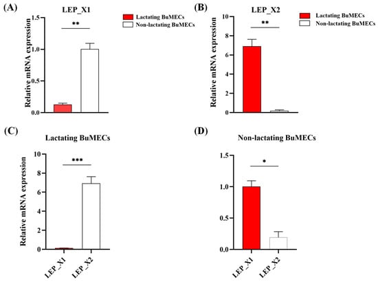 Differential expression of LEP_X1 (A), LEP_X2 (B), along with LEP expression in lactating (C) and non-lactating (D) BuMECs. Values are presented as means ± SEM; * p < 0.05, ** p < 0.01, *** p < 0.001.