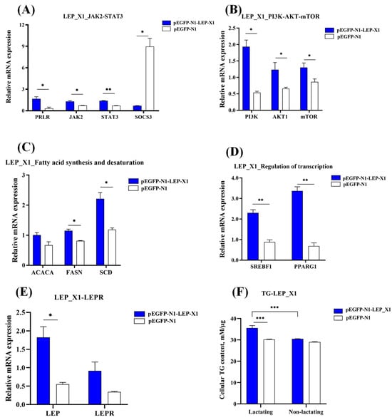 To explore the effect of LEP_X1 on milk fat synthesis, the overexpression vector pEGFP-N1-LEP_X1 was transfected into BuMECs. We then examined changes in the expression of genes related to milk fat synthesis within JAK2-STAT3 (JAK2, STAT3, and SOCS3) and mTOR (PI3K, AKT1, and mTOR) signaling pathways, fatty acid synthesis and desaturation (ACACA, FASN, and SCD), and transcriptional regulation (SREBF1 and PPARG) processes. Compared to the negative control (NC, pEGFP-N1), LEP_X1 overexpression significantly increased the expression of PRLR (p < 0.05), JAK2 (p < 0.05), and STAT3 (p < 0.01) while decreasing SOCS3 (p < 0.05) (Figure 8A). Additionally, it significantly upregulated PI3K (p < 0.05), AKT1 (p < 0.05), and mTOR (p < 0.05) (Figure 8B), as well as FASN (p < 0.05), SCD (p < 0.05) (Figure 8C), and SREBF1 (p < 0.01), and PPARG (p < 0.01) (Figure 8D). This was also accompanied by an increase in cellular TG (p < 0.001, Figure 8F) in lactating BuMECs. However, ACACA (p > 0.05, Figure 8C) and LEPR (p > 0.05, Figure 8E) expression levels were unaffected.