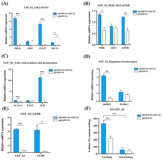 Effects of LEP_X2 overexpression on milk fat synthesis in BuMECs with PRL. Changes are shown for the JAK2-STAT3 signaling pathway (A), the mTOR signaling pathway (B), fatty acid synthesis and desaturation (C), regulation of transcription (D), LEPR expression (E), and cellular TG concentration (F). Data are presented as means ± SEM for three individual cultures; * p < 0.05, ** p < 0.01, *** p < 0.001.