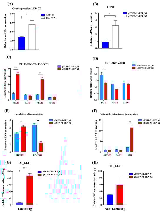 Comparison of gene expression related to milk fat synthesis following LEP_X1 and LEP_X2 overexpression. The expression levels of LEP_X1 after overexpression of LEP_X2 (A), LEPR (B), genes in the JAK2-STAT3 signaling pathway (C), the mTOR signaling pathway (D), regulation of transcription (E), fatty acid synthesis and desaturation (F), and cellular TG concentration in lactating (G) and non-lactating (H). Data are presented as means ± SEM for three individual cultures; * p < 0.05, ** p < 0.01, *** p < 0.001.