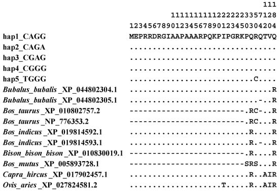 Differences in LEP amino acid sequences among Bovidae species. Numbers represent positions. Different letters represent different amino acids. Dots (⋅) indicate identity with hap1_CAGG. Horizontal bars (-) indicate amino acid deletions.