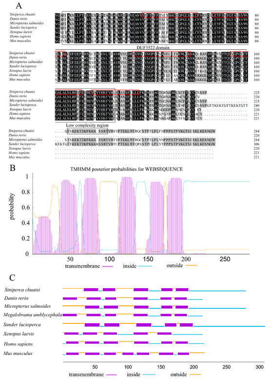 Amino acid sequence comparison and homology analysis of the Myomaker protein. (A): Amino acid sequence alignment of Myomaker of Chinese perch and other species. Identical amino acid residues are indicated with a black background and similar amino acid residues are shaded. Predicted protein domains are shown with boxes, and the red boxes show the transmembrane domain of the Chinese perch Myomaker. (B,C): Predictions of transmembrane domains in Chinese perch and other species Myomaker protein using the TMHMM Server v. 2.0. The x-axis indicates the number of amino acids. The y-axis represents the probability of each amino acid being in the transmembrane region, inside and outside the cell membrane. GeneBank accession numbers: Danio rerio, NP_001002088.1; Micropterus salmoides, XP_038559766.1; Megalobrama amblycephala, XP_048045299.1; Siniperca chuatsi, XP_044052078.1; Sander lucioperca, XP_031161515.1; Xenopus laevis, XP_041428255.1; Mus musculus, NP_079652.1; Homo sapiens, NP_001073952.1.