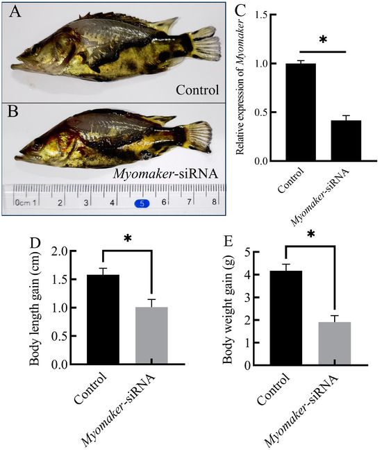 To verify the knockdown efficiency of Myomaker-siRNA, the relative expression of Myomaker was detected in control and Myomaker-siRNA group by RT-qPCR. The results showed that Myomaker expression was reduced by the Myomaker-siRNA (Figure 3C), and the difference was statistically significant compared with control (p < 0.05). After 21 days of Myomaker-siRNA interference, the body length in control increased by 1.6 ± 0.26 cm, while the Myomaker-siRNA group increased by 1.0 ± 0.3 cm (Table 2, Figure 3A,B,D). The body weight in control increased by 4.1 ± 0.31 g, while the Myomaker-siRNA group increased by 1.9 ± 0.26 g (Table 2, Figure 3E). There was a significant difference in body length and body weight gain between the control and Myomaker-siRNA groups. The results indicated that the growth of Chinese perch juveniles was significantly inhibited after interfering with Myomaker expression.