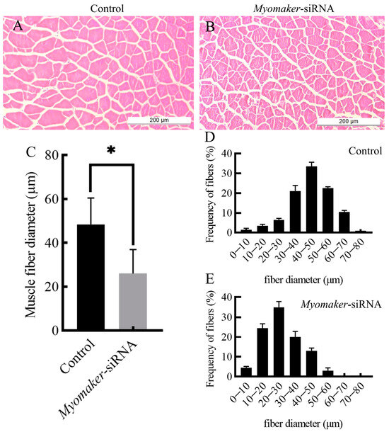 Histological section analysis of skeletal muscle in control and Myomaker-siRNA groups. HE staining showing cross sections of fast muscles in control and Myomaker-siRNA groups (A,B). The muscle fibers diameter in control and Myomaker-siRNA groups (C). Frequency distribution of muscle fiber diameter in control and Myomaker-siRNA groups (D,E). Values in the figures are the mean ± SEM, n = 6. * Indicates the significant difference in expression between the control and Myomaker-siRNA groups (p < 0.05).
