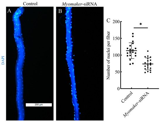 Single fiber analysis of nuclear numbers in skeletal muscles from control and Myomaker-siRNA groups. Control (A) and Myomaker-siRNA (B) groups single muscle fibers were isolated were stained by DAPI (blue), and photographed by fluorescence microscopy. Statistical analysis of nuclear numbers in muscle fibers from control and Myomaker-siRNA groups (C). Values in the figures are the mean ± SEM, n = 20. Each square and circle represent the number of single fiber nuclei in the control group and the Myomaker-siRNA group, respectively. * Indicates the significant difference between the control and the Myomaker-siRNA groups (p < 0.05).