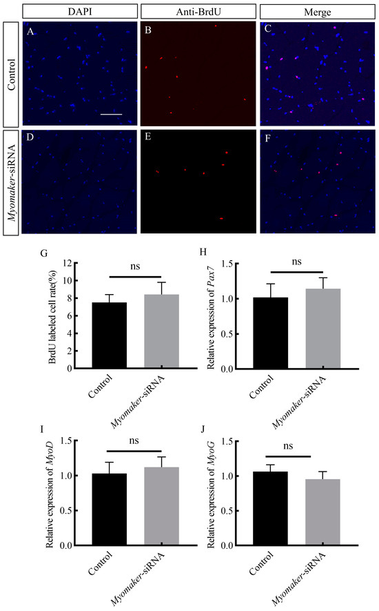 Effects of interfering with Myomaker expression on myoblast proliferation and differentiation. Immunofluorescence labeling of the transverse section of muscle fibers in control and Myomaker-siRNA groups (A–F). Nuclei were labeled with DAPI (blue), proliferating cells were labeled with BrdU antibody (red), and cells whose nuclei were colocalized with BrdU were labeled magenta. (G): Comparison of the frequency of proliferating cells in the control and Myomaker-siRNA groups. Effect of interfering with Myomaker on expressing Pax7, MyoD and MyoG (H–J). ns. stands for no significant difference (p > 0.05). Scale bar is 25 μm.