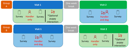 This project employed a crossover design, whereby each participant participated in two sessions. For half of the participants (i.e., Group A), the first session included a 20 min interaction with a handler alone, and the second visit included an interaction with a puppy and handler. For the other half of participants (i.e., Group B), the sessions were reversed, with the interaction with a puppy and handler occurring first (see Figure 1).