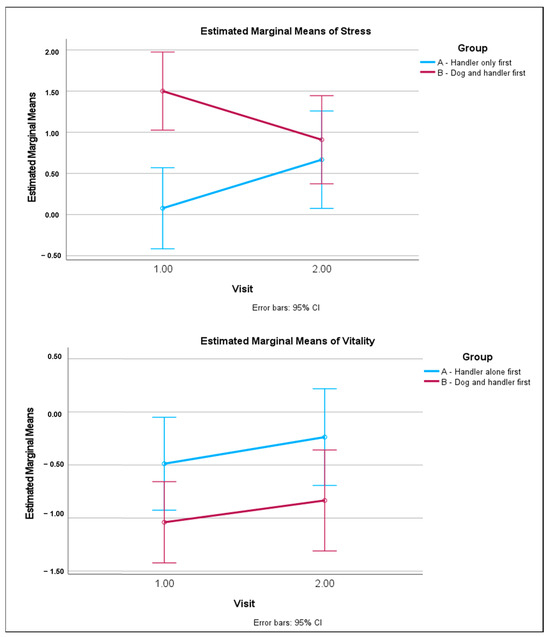 Estimated marginal means of stress and vitality between groups at different visits. Changes between pre- and post-interaction scores are reported, in which a higher score means a larger reduction after the interaction.