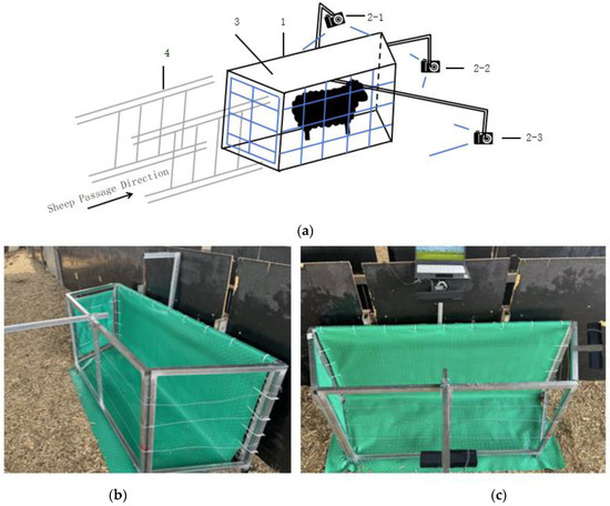 The sheep depth map data acquisition system, where (a) shows the system design diagram, with 1 being the trapezoidal limit bar, 2 being the depth camera, 3 being the background cloth, and 4 being the limit channel; (b,c) shows the physical diagram of the system.