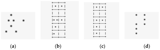 A schematic diagram of the point cloud voxel filtering process, where “*” represents a point cloud, (a) is the original point cloud, (b) is the grid division, (c) is the calculation of representative points, and (d) is the output of points.