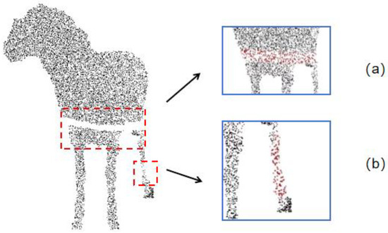 - Statistical Outlier Removal: To eliminate the influence of outlier noise points, statistical filtering is used to remove abnormal points around the sheep, i.e., the elimination of discrete isolated points in the point cloud. This filter is based on the Gaussian distribution characteristics of the points. First, for each point in the point cloud, the k-nearest neighbors are calculated, and the Euclidean distances from these neighbors to the point are computed. The average of these distances is taken as the characteristic distance of the point. Next, a threshold is set based on statistical principles to remove abnormal points: all characteristic distances are statistically analyzed using the mean and standard deviation. A threshold R, which is the mean plus the standard deviation, is set. Points with distances exceeding this threshold are considered abnormal and are removed. In this study, the threshold R is set to 0.6. The effects before and after filtering are shown in Figure 3a,b.