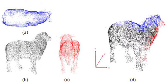 The effect of point cloud reconstruction from three views, where (a) is the top view of the sheep point cloud, (b) is the side view of the sheep point cloud, (c) is the front view of the sheep point cloud, and (d) is the reconstruction effect diagram of the point cloud from the three perspectives, with the points in three different colors each originating from the single perspectives of (a–c).