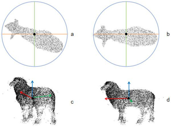 The effect of the sheep body rotation normalization algorithm is shown, with the black dot representing the axis center of the sheep body, and the surrounding rays indicating the coordinate directions. (a,c) are the top view and side view of the sheep body with an inclination angle, while (b,d) are the top view and side view of the sheep body after adjustment by the normalization algorithm.