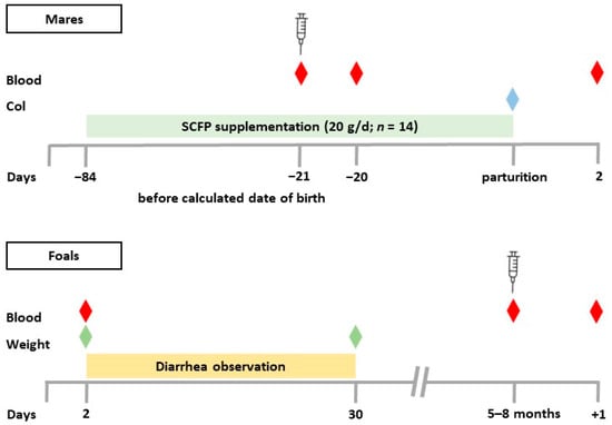 The study was conducted on a farm in Lower Saxony, Germany and approved by the State of Lower Saxony, Germany, in accordance with § 8(1) of the Animal Protection Act in conjunction with § 33 of the Animal Protection Experimental Animal Regulations (File number: 33.19-42502-04-22-00254). Twenty-six mares (approximately 500–700 kg body weight), Hannoveraner breed, in gestation were assigned to two groups, SCFP-supplemented group (SCFP) and control group (CON), according to age and parity (Table S1). Their foals were classified accordingly with 4 fillies and 10 colts in the group of supplemented mares (SCFP) and 5 fillies and 7 colts in the control group (CON). All foals were born in the 2023 foaling season with the first foal born in mid-January and the last two in early June. The treatment groups were balanced for expecting foaling date (Table S2). All mares were housed in the same facility in individual stalls. They were handled in the same manner with respect to food, feeding times, and turnout times. Their foals were treated as similarly as possible. Depending on weather conditions, they had access to different areas (pasture, paddock, indoor arena). Horses (SCFP and CON) were comingled during turnout before parturition, the first 30 days after parturition as well as after the 30-day observation period on permanent pastures. Due to different birth months, it was not possible to provide identical turnout handling for all foals. During the first 30 days, the group size was variable and depended on the area (for example: max. 4 mares with their foals in the indoor arena, max. 6 mares and their foals on the pasture) and on the number of foals born. After the 30 days period, groups of 6–16 mares with their foals were moved to permanent pasture, depending on pasture size and amount of grass, regardless of previous supplementation classification.
