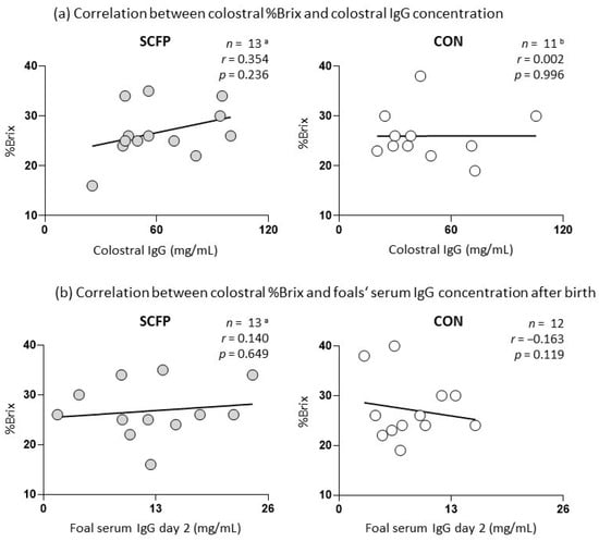 Correlation plots illustrating the correlation of colostral Brix values with colostral IgG and IgG concentration in foal serum after parturition (day 2); a one SCFP sample was excluded from the study due to death of a mare and foal shortly after foaling; b one CON colostrum sample was not usable for IgG detection; SCFP: supplemented group; CON: control group; n: number; r: r-value; and p: p-value.