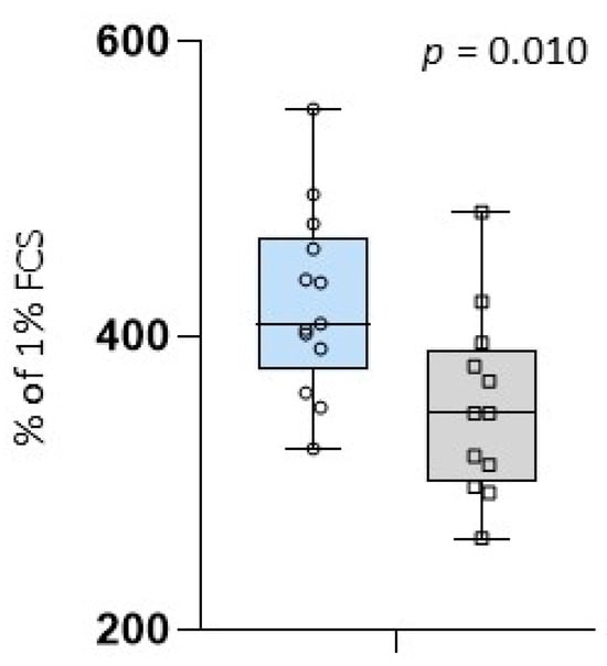 Average value of cell growth incubated in colostrum given in % of 1% FCS; blue box: colostrum samples of supplemented mares (SCFP); grey box: colostrum samples of the control group (CON); circles and squares show the individual values of each colostrum sample; and p = p-value.