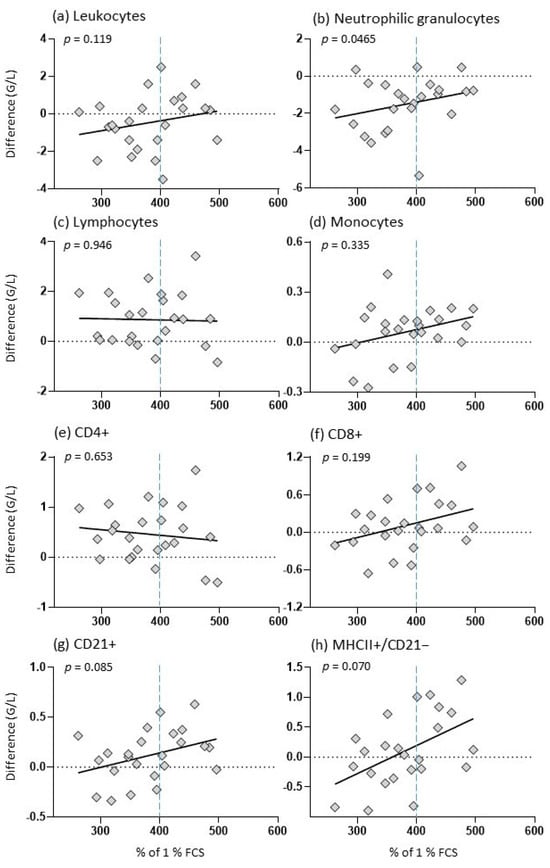 Vaccine-induced differences in the blood composition of foals at 5 to 8 months of age correlated significantly with the bioactivity of colostrum samples in terms of neutrophil granulocytes (Figure 4b). A trend was observed for CD21+ B cells and MHCII+/CD21− (Figure 4g,h). The mares producing colostrum with higher biological activity (above 400% of 1% FCS) tended to have foals with a larger difference in leukocytes, neutrophils, monocytes, CD8+ T cells, CD21+ B cells and circulating MHCII+/CD21− cells, whereas mares producing colostrum with a biological activity below this threshold tended to have foals with a smaller difference in cell numbers. While the foals’ vaccine-induced reaction of lymphocytes remained unchanged regarding the colostral bioactivity, foals which ingested colostrum with higher bioactivity tended to have smaller differences in CD4+ T cells compared to foals ingesting lower bioactive colostrum (Figure 4c,e).