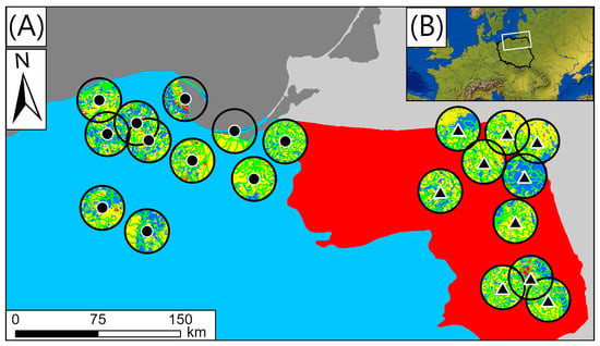 Distribution of heronries in northern (black circles) and northeastern Poland (black triangles) (A) and location of the studied area in Europe (B). Each circle represents a 20 km buffer zone from the center of each colony. Colors within buffer zones stand for various habitat types, i.e., blue—forest (potential nesting sites), green—foraging areas optimal for Grey Herons (hydrographic features, wetlands, coastal zone), yellow—suboptimal foraging areas (farmlands, grassy, open areas, etc.), red—urban zones (avoided by Grey Heron). Two color zones symbolize Poland megaregions adapted from [18]: Beyond-Alps Europe (blue) and East European Plain (red). Map source: naturalearthdata.com (accessed on 30 September 2023).
