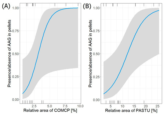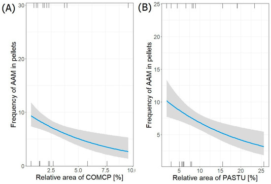 Frequency of water vole (AAM) in pellets from both regions in relation to relative area of (A) COMCP and (B) PASTU in foraging areas around heronries. Blue lines indicate GLM fit; rug plots of negative (bottom) and positive (top) residuals.