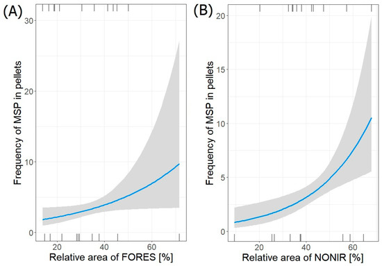 Frequency of Microtus sp. (MSP) in pellets from both regions in relation to relative area of (A) FORES and (B) NONIR in foraging areas around heronries. Blue lines indicate GLM fit; rug plots of negative (bottom) and positive (top) residuals.