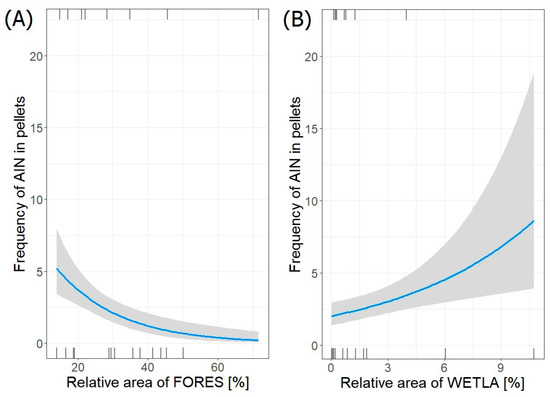 Frequency of aquatic invertebrates (AIN) in pellets from both regions in relation to relative area of (A) FORES and (B) WETLA in foraging areas around heronries. Blue lines indicate GLM fit; rug plots of negative (bottom) and positive (top) residuals.