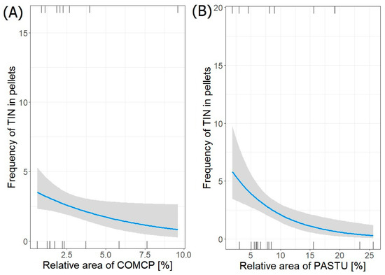 Frequency of terrestrial invertebrate (TIN) in pellets from both regions in relation to relative area of (A) COMCP and (B) PASTU in foraging areas around heronries. Blue lines indicate GLM fit; rug plots of negative (bottom) and positive (top) residuals.