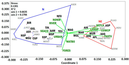 The first two axes explained 66.4% of the observed variance with a stress value of 13.01% and clustered opposite to the Coordinate 2 axis in the results biplot (explaining 17.1% of observed variance) (Figure 7). A cluster representing the N region included the following prey items: European water vole (AAM), wood mouse (ASY), bird taxa (BIR), species of genus Crocidura (CSP), European edible dormouse (GGL), species of genus Neomys (NSP), vole sp. (MSP), European pine vole (MSU), Eurasian water shrew (NFO), species of genus Sorex (SSP), European mole (TEU), and terrestrial invertebrates (TIN). The cluster representing the NE region includes five prey taxa: striped field mouse (AAG), yellow-necked mouse (AFL), tundra vole (AOE), species of genus Apodemus (ASP), and species from the family of Muridae (MUR). Taxa that are outside the convex hulls of both regions are aquatic invertebrates (AIN), short-tailed field vole (MAG), common vole (MAR), and bank vole (MGL).