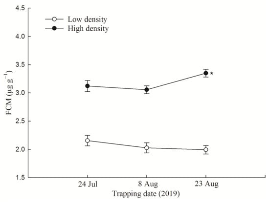 Mean F1 FCM levels were 2.052 ± 0.049 and 3.158 ± 0.046 μg g−1 in low-density and high-density treatment groups, respectively. We found significant effects of treatment (p < 0.001) and time × treatment interaction (p = 0.023), but no significant effect of time (p = 0.179; Figure 1). Statistical analysis indicated that FCM in the high-density treatment group was significantly higher than that in the low-density treatment group across all trapping sessions (p < 0.05).