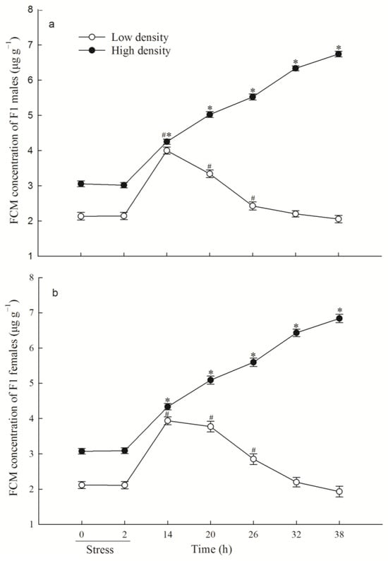 Fecal corticosterone metabolite (FCM) response to acute immobilization stress between two replicate treatment male (a) (mean ± SE) (N = 19 and 38 in the low-density and high-density F1 group, respectively) and female (b) (mean ± SE) (N = 22 and 36 in the low-density and high-density F1 group, respectively) F1 groups. p < 0.05 vs. basal level for the low-density (hash symbol) and high-density groups (asterisk).