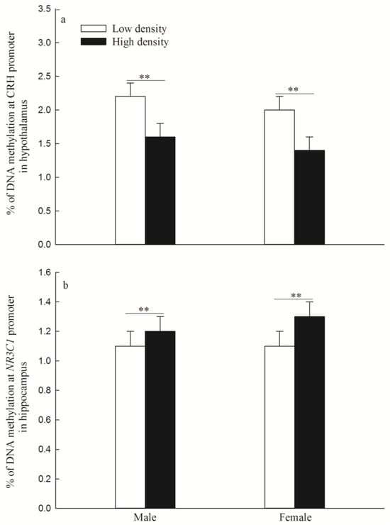 DNA methylation levels of corticotropin-releasing hormone (CRH) gene (a) (mean ± SE) and glucocorticoid receptor gene (NR3C1) (b) (mean ± SE). “**” indicates p < 0.01 between low density and high density.