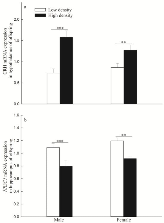 The mRNA expression of corticotropin-releasing hormone (CRH) gene (a) (mean ± SE) and glucocorticoid receptor gene (NR3C1) (b) (mean ± SE). “**” and “***” indicate p < 0.01 and p < 0.001 between low density and high density, respectively.