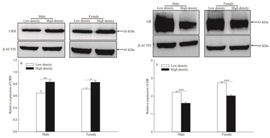 The protein expression of corticotropin-releasing hormone (CRH) (a) and glucocorticoid receptor gene (NR3C1) (b) in F1. Data were expressed as mean ± SE for each group. “*”, “**” and “***” indicate p < 0.05, p < 0.01 and p < 0.001 between low density and high density, respectively.