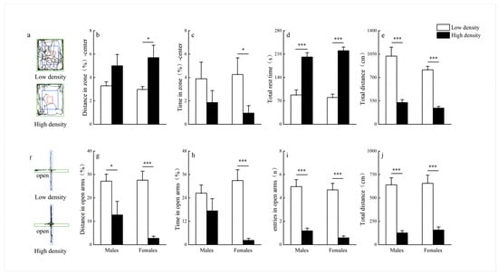 In the EPM test, our findings revealed that the high-density treatment groups had a lower percentage of distance in the open arms (males: p = 0.038; females: p < 0.001; Figure 6g), lower percentage of time in the open arms in females (p < 0.001; Figure 6h), lower entries into the open arms (males: p < 0.001; females: p < 0.001; Figure 6i) and shorter total distance (males: p < 0.001; females: p < 0.001; Figure 6j) compared to low-density treatment groups.