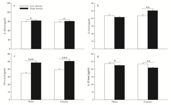 The levels of IL-1β (a) (mean ± SE), IL-6 (b) (mean ± SE), TNF-α (c) (mean ± SE), and IL-10 (d) (mean ± SE) between two replicate treatment F1 groups. “*”, “**” and “***” indicate p < 0.05, p < 0.01 and p < 0.001 between low density and high density, respectively. N = 26 and 32 for males, N = 18 and 22 for females, in the low-density and high-density F1 group, respectively.