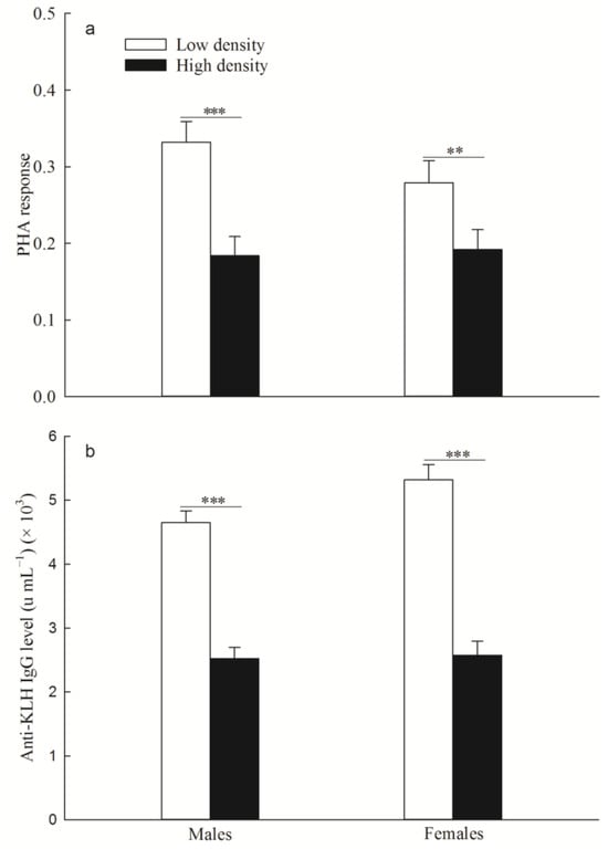 Phytohemagglutinin (PHA) response (a) (mean ± SE) (male: N = 23 and 33, female: N = 20 and 28, in the low−density and high−density F1 group, respectively) and anti−keyhole limpet hemocyanin immunoglobulin G (anti−KLH IgG) level (b) (mean ± SE) (male: N = 32 and 35, female: N = 19 and 23, in the low−density and high−density F1 group, respectively) between two replicate treatment F1 groups. “**” and “***” indicate p < 0.01 and p < 0.001 between low density and high density, respectively.