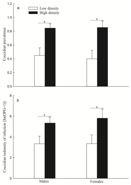 The prevalence of coccidia (males: p = 0.035; females: p = 0.044; Figure 9a) and the intensity of coccidial infection (males: p = 0.035; females: p = 0.047; Figure 9b) were significantly higher in the high-density group than in the low-density group.