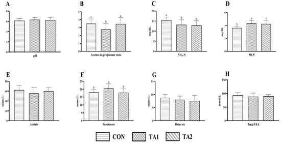 Effect of tannin supplementation on ruminal fermentation characteristics of fattening lambs. (A) pH, (B) acetate-to-propionate ratio, (C) NH3-N, (D) MCP, (E) acetate, (F) propionate, (G) butyrate, and (H) total VFA. NH3-N, ammonia nitrogen; MCP, microbial protein; VFA, volatile fatty acid. CON, TA1, and TA2 were fattening lambs fed the basal diet and supplemented with tannin at the dosages of 0, 3, and 6 g/d per animal, respectively. Columns with different small letters differ significantly (p < 0.05).