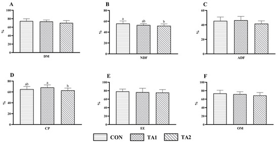 Effect of tannin supplementation on the nutrient digestibility of fattening lambs. (A) DM, (B) NDF, (C) ADF, (D) CP, (E) EE, and (F) OM. DM, dry matter; NDF, neutral detergent fiber; ADF, acid detergent fiber; CP, crude protein; EE, ether extract; OM, organic matter. CON, TA1, and TA2 were fattening lambs fed the basal diet and supplemented with tannin at the dosages of 0, 3, and 6 g/d per animal, respectively. Columns with different small letters differ significantly (p < 0.05).