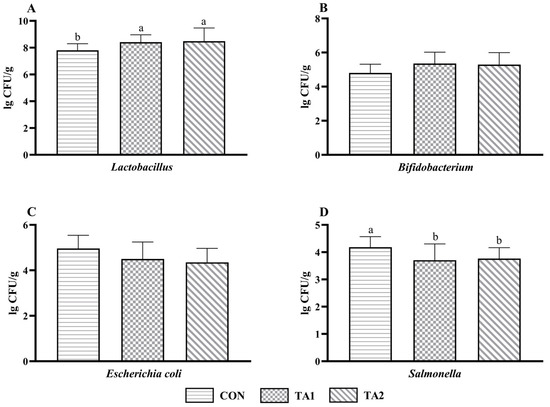 Evidently, tannin supplementation significantly increased (p < 0.05) the Lactobacillus count (Figure 3A) in the feces of the lambs. The TA1 lambs tended to have a higher (0.05 < p < 0.10) Bifidobacterium count (Figure 3B) as compared with the CON lambs. In addition, the number of Escherichia coli (Figure 3C) in the TA2 group was slightly lower (0.05 < p < 0.10) than that in the CON group. Lambs fed tannin displayed a markedly decreased (p < 0.05) Salmonella count (Figure 1D) in their feces.
