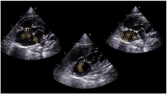The ferret underwent a conventional transthoracic echocardiographic examination using a 12 MHz phased array ultrasound machine (Vivid IQ, General Electric, Boston, MA, USA). Echocardiographic findings included the presence of multiple parallel hyperechoic “equal signs” in the right atrium, indicating the presence of adult heartworms (Figure 1) [3,6]. Moderate dilatation of the pulmonary trunk, right atrium, and right ventricle was demonstrated with the presence of tricuspid regurgitation with a maximum velocity of 3.08 m/s (Table 1) [8].