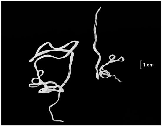 Prior to surgery, the ferret was hospitalized without medication, sedation, or fluid therapy. Anesthesia was induced and maintained with 2.5% isoflurane. The ferret was placed in a left lateral decubitus position and a conventional Seldinger technique was used through a venotomy in the right jugular vein [17,18]. A 4 French introducer was used and under fluoroscopic guidance (OEC One CFD, General Electric, Boston, MA, USA) a basket endoscopic retrieval device (Snare-System; 2.5–5 mm, Merit Medical, West Merit Parkway, South Jordan, UT, USA) was advanced into the right atrial cavity. Two heartworms (one male with conical and spirally coil, five pairs of preanal papillae, and six pairs of postanal papillae and one female with rounded caudal end and the vulvar opening located behind the junction of the esophagus and intestine) were removed manually with care (Figure 2). The jugular vein was then permanently ligated using vascular clips, and the incision was routinely sutured. A postoperative transthoracic echocardiogram documented the absence of heartworms.