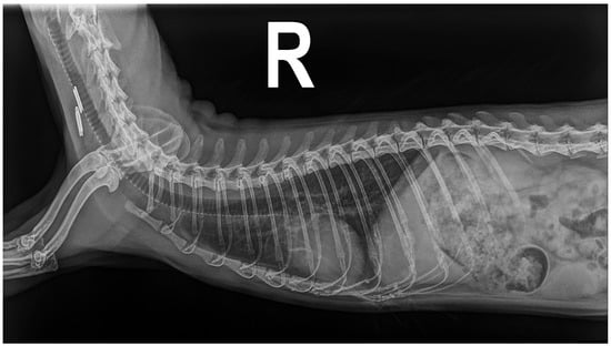 A new radiological study was performed, and the dorsoventral projection showed a slight improvement in the tortuosity and dilatation of the caudal pulmonary arteries with a ratio of 1.08 between the ninth rib and the left caudal pulmonary artery. The inverted D-shaped cardiac morphology was also reported. The right lateral projection (Figure 3) confirmed the improvement of the pulmonary broncho-interstitial pattern and the reduction in the VHS to 5.5 [6,14,15]. An electrocardiographic study was repeated and showed a sinus rhythm of the order of 210 beats per minute with a cardiac axis of 74°, without pathological changes. The echocardiographic study performed during the evaluation of the animal showed the absence of parasites in the ventricles and vena cava, while a decrease in the velocity of tricuspid regurgitation (2.8 m/s) and a decrease in the diameter of the atrium, ventricle, and pulmonary trunk were demonstrated (Table 1) [8,13].