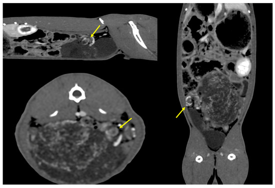 CT scan after contrast agent administration revealed a whirlpool sign detected in cases of organ torsion, consisting of a centrifugal vascular pattern (yellow arrows) laterally to the mass.