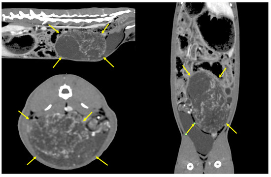 The mass extended from the caudal pole of the left ovary until the dorsal portion of the urinary bladder. The left ovary and uterus were mildly displaced by the mass itself. Possible differential diagnoses included ovarian or uterine neoplasia or a granulomatous peritoneal lesion (Figure 2). No signs of metastatic lesions were detected within the study in the lungs, brain, liver, or bones. Abdominal lymph nodes were unremarkable.