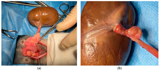 Following anesthesia induction, the rabbit was positioned in dorsal recumbency, and the abdomen was surgically prepared. A 5 cm midline prepubic incision was made using a 21 mm scalpel, and subcutaneous tissues were dissected with forceps until the linea alba was reached and incised. Upon opening the abdomen, a voluminous brown mass with smooth margins and parenchymatous consistency was discovered. Anatomically, the mass corresponded to the right ovary, exhibiting severe torsion of the ovarian pedicle and ligament, along with twisting of the ovarian vessels (Figure 3).