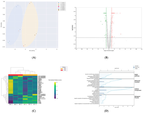 Summary of the DEGs (DEG; p < 0.05, ≥2.0-fold change) in the porcine jejunum under HS temperature. (A) PCA based on DEGs of the NT and HS groups; (B) volcano plot of HS and NT groups; (C) clustering heatmap of DEGs in HS and NT groups; (D) functional annotation chart of the DEGs in NT and HS groups. NT, normal temperature; HS, heat stress.