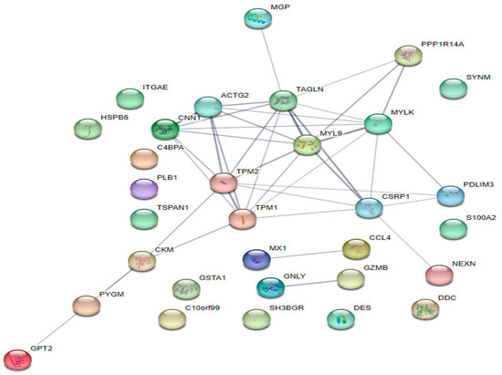 The network for the interaction between genes and DEGs of NT and HS treatments is presented in Figure 2. According to gene interaction network analysis, significant gene interactions were associated with myosin light chain 9 (MYL9). Moreover, there were eight significant genes interacting with MYL9.