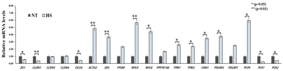The relative mRNA levels of the selected genes were compared at different temperatures (NT vs. HS) (Figure 3). Among the selected genes, 14 of the 19 genes revealed significant differences between the NT and HS groups. Response to HS in genes related to gut integrity resulted in downregulation of ZO1, CLDN1, and OCLN compared to the NT condition. Regarding actin cytoskeleton and filament, HS treatment revealed significantly higher relative mRNA levels of ACTG2, DES, and MYL9 than the NT treatment (p < 0.01). Furthermore, the HS group was significantly upregulated in TPM1, TPM2, CNN1, PDLIM3, and PCP4 compared to the NT group (p < 0.05). However, the relative mRNA levels of PCK1 and PCK2 presented significantly downregulated expression in the HS group compared to those in the NT group (p < 0.05).