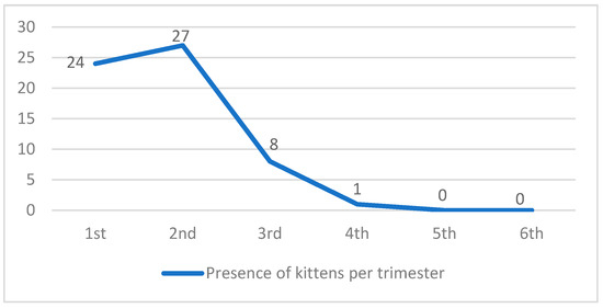 Two females in the colony were visibly pregnant and were referred to foster homes where they gave birth to five and seven kittens each. Another female was found to be pregnant during a clinical examination and was therefore excluded from sterilization and sent to a foster home where she gave birth to five kittens. The remaining pregnant females (n = 6; 11.5%) underwent sterilization.